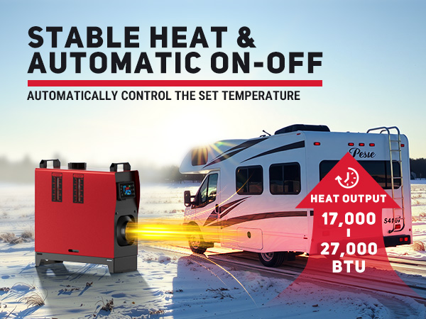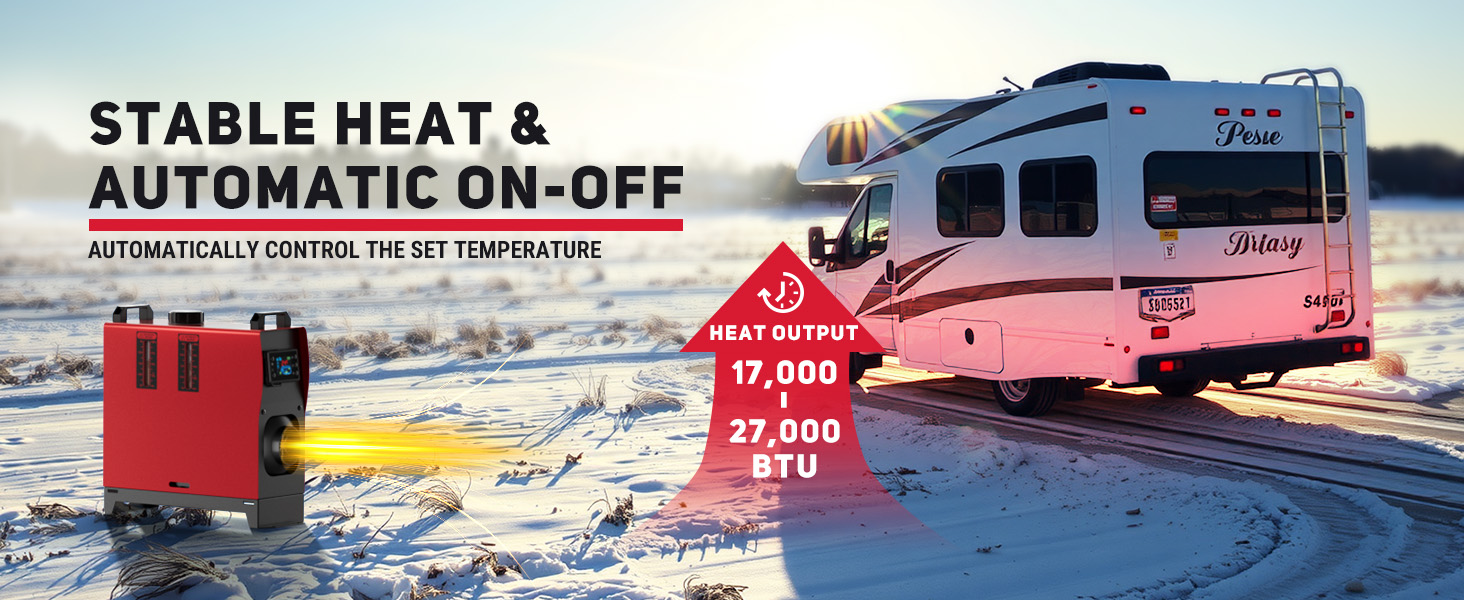 The BreAro 8KW Diesel Heater, powered by a 12V rated voltage, utilizes a sandblasted aluminum heat exchanger to quickly generate and transfer heat, significantly improving efficiency and expanding coverage. It outputs 4700–17000 BTU of heat, warming spaces up to 215–269 ft² (20–25 m²) in just 10 minutes, allowing you to enjoy a warm, comfortable environment in no time.